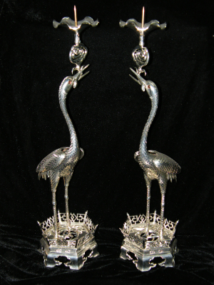 作品采用百分之99.9的云南精锡制作,运用莱芜锡雕传统雕刻手法中的阴雕和阳雕在手工打造出的鹤体上雕出羽毛和腿上的鳞片,仙鹤的双翅用一独家手法,悬浮在鹤体上,当插 上点燃的蜡烛时,鹤的双翅随着气流的扰动微微颤动,让人叹为观止。